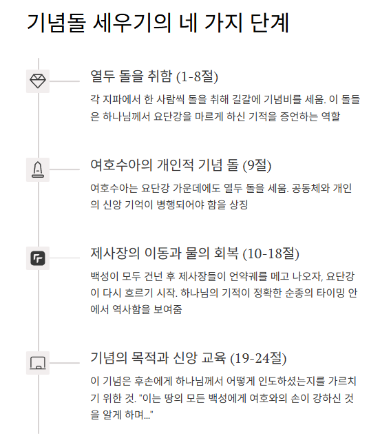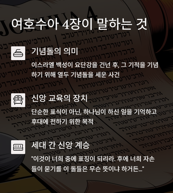 여호수아 4장은 이스라엘 백성이 요단강을 건넌 후, 그 기적을 기념하기 위해 열두 기념돌을 세우는 사건을 기록합니다.