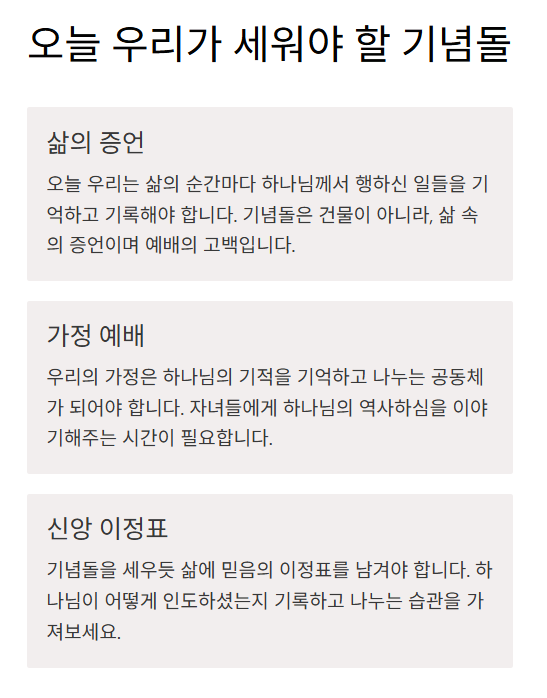 기념돌은 건물이 아니라, 삶 속의 증언이며 예배의 고백입니다.