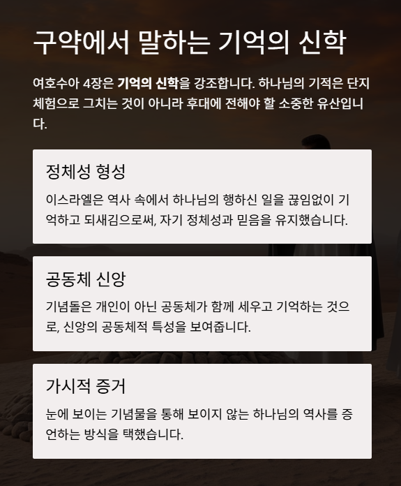 여호수아 4장은 기억의 신학을 강조합니다.