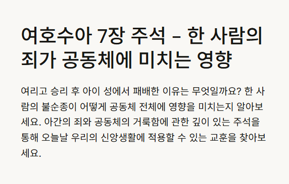 여호수아 7장은 여리고 전투의 승리 직후, 아이 성 전투에서의 실패 원인을 드러내는 본문입니다.