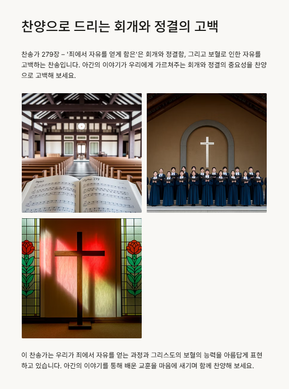 회개와 정결함, 그리고 보혈로 인한 자유를 고백하는 찬송입니다.