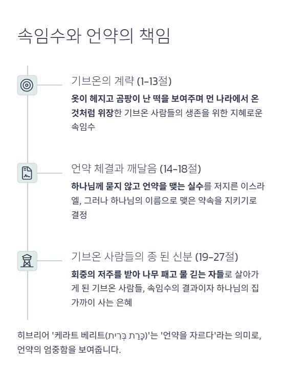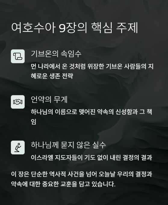 여호수아 9장은 기브온 사람들이 이스라엘을 속여 언약을 맺는 이야기를 담고 있습니다.
