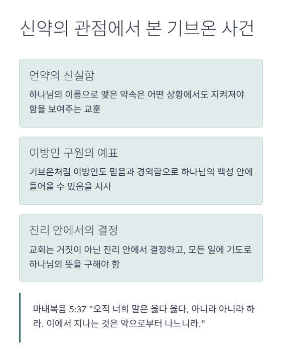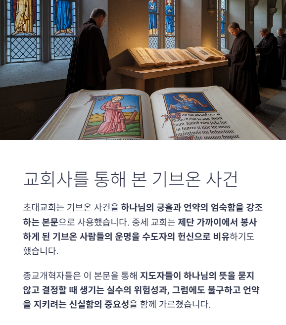 초대교회는 기브온 사건을 하나님의 긍휼과 언약의 엄숙함을 강조하는 본문으로 사용했습니다.