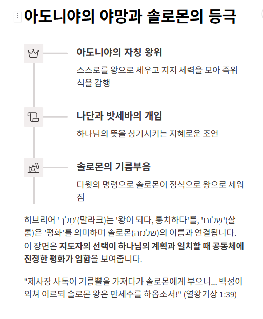 - 본문 주석 – 아도니야의 자칭 왕위와 솔로몬의 등극