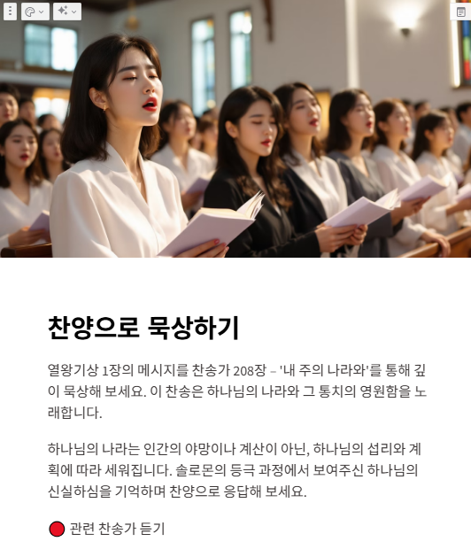 열왕기상 1장은 다윗의 노쇠함과 그를 둘러싼 왕권 계승의 긴장을 배경으로, 아도니야가 자칭 왕이 되려는 시도와 결국 하나님의 뜻에 따라 솔로몬이 왕으로 세워지는 과정을 담고 있습니다. 이는 단순한 정치적 사건이 아니라, 하나님의 언약과 예언의 성취라는 관점에서 읽어야 할 중요한 본문입니다.