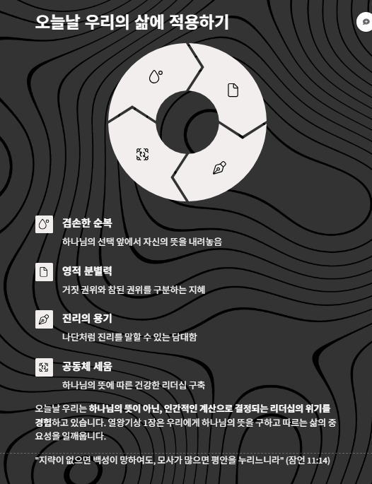 오늘날 우리는 하나님의 뜻이 아닌, 인간적인 계산으로 결정되는 리더십의 위기를 경험하고 있습니다. 열왕기상 1장은 하나님의 선택 앞에서 겸손히 순복하고, 거짓 권위를 분별하며, 신실한 자를 세우는 지혜와 용기를 우리에게 요구합니다. 또한 나단처럼 진리를 말할 수 있는 용기 있는 조언자가 오늘날 교회와 사회에 절실합니다.