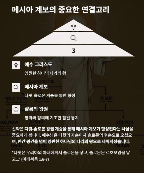 신약은 다윗-솔로몬 왕권 계승을 통해 메시아 계보가 형성된다는 사실을 중요하게 봅니다. 예수님은 다윗의 자손이자 솔로몬의 후손으로 오셨으며, 인간 왕권을 넘어 영원한 하나님의 나라의 왕으로 세워지셨습니다. 또한 예수님의 왕권은 평화(샬롬)와 정의에 기초한 참된 왕권임을 예고합니다.