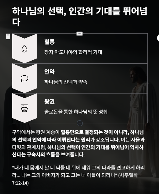 구약에서는 왕권 계승이 혈통만으로 결정되는 것이 아니라, 하나님의 선택과 언약에 따라 이뤄진다는 원리가 강조됩니다. 아도니야는 장자로서 합리적 계승자처럼 보였으나, 하나님께서 택하신 이는 솔로몬이었습니다. 이는 사울과 다윗의 관계처럼, 하나님의 선택이 인간의 기대를 뛰어넘어 역사하신다는 구속사의 흐름을 보여줍니다.