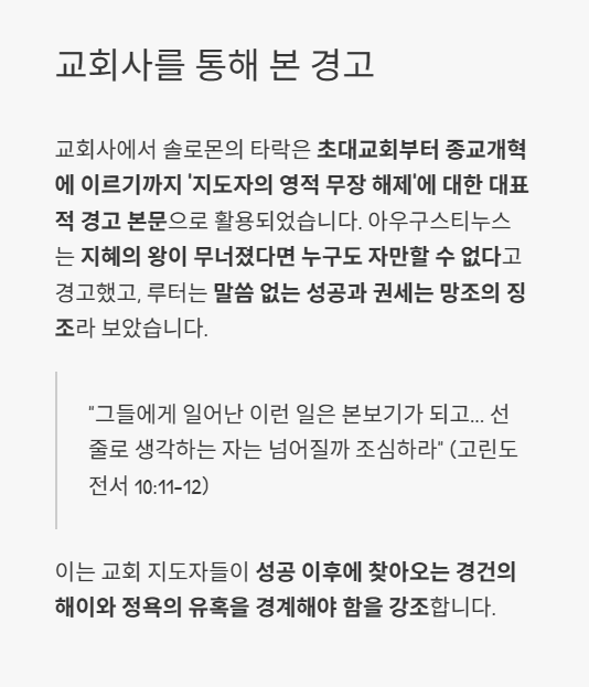 교회사에서 솔로몬의 타락은 초대교회부터 종교개혁에 이르기까지 ‘지도자의 영적 무장 해제’에 대한 대표적 경고 본문으로 활용되었습니다. 아우구스티누스는 지혜의 왕이 무너졌다면 누구도 자만할 수 없다고 경고했고, 루터는 말씀 없는 성공과 권세는 망조의 징조라 보았습니다. 이는 교회 지도자들이 성공 이후에 찾아오는 경건의 해이와 정욕의 유혹을 경계해야 함을 강조합니다.