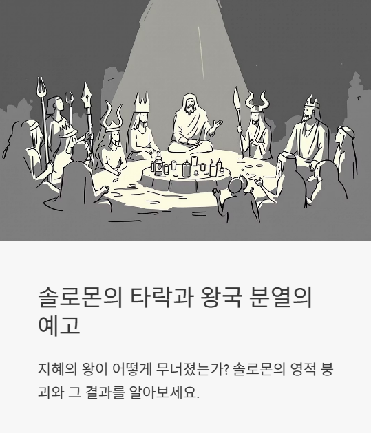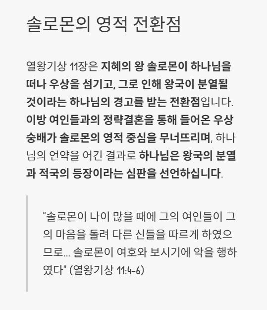 열왕기상 11장은 지혜의 왕 솔로몬이 하나님을 떠나 우상을 섬기고, 그로 인해 왕국이 분열될 것이라는 하나님의 경고를 받는 전환점입니다. 이방 여인들과의 정략결혼을 통해 들어온 우상 숭배가 솔로몬의 영적 중심을 무너뜨리며, 하나님의 언약을 어긴 결과로 하나님은 왕국의 분열과 적국의 등장이라는 심판을 선언하십니다.