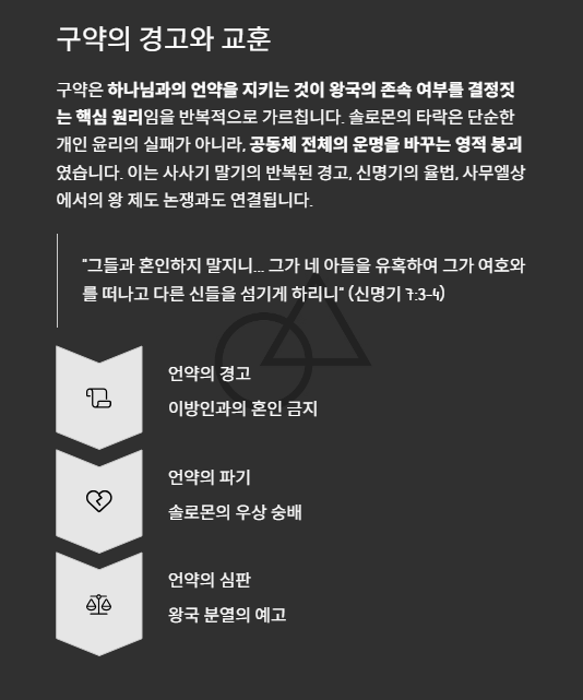 구약은 하나님과의 언약을 지키는 것이 왕국의 존속 여부를 결정짓는 핵심 원리임을 반복적으로 가르칩니다. 솔로몬의 타락은 단순한 개인 윤리의 실패가 아니라, 공동체 전체의 운명을 바꾸는 영적 붕괴였습니다. 이는 사사기 말기의 반복된 경고, 신명기의 율법, 사무엘상에서의 왕 제도 논쟁과도 연결됩니다.