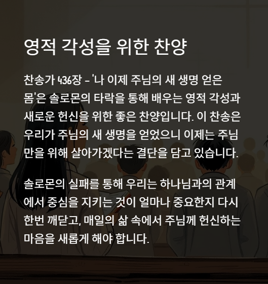 오늘날 신자와 교회는 겉으로 보기에 화려하고 강대한 체계일지라도, 중심이 무너지면 모든 것은 흔들릴 수 있음을 솔로몬의 실패를 통해 배워야 합니다. 우리는 지혜로운 말보다 지혜로운 삶, 건물보다 언약의 순종을 우선시하며, 하나님의 기준 앞에서 겸손히 살아가야 합니다. 또한 이방 문화와 가치에 무비판적으로 동화되지 않도록 깨어 있어야 하며, 개인의 사소한 타협이 공동체 전체에 미치는 영향을 성찰해야 합니다.