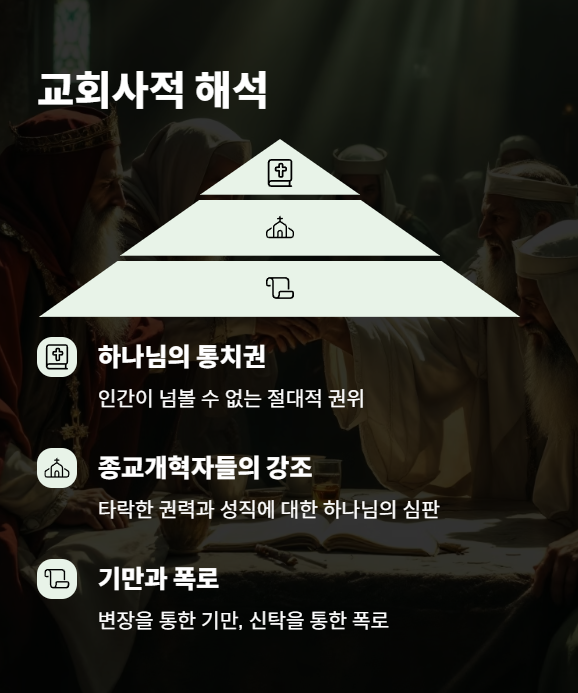 교회사에서 이 본문은 권력자와 정치 지도자들의 영적 타락과 그에 따른 파국을 경고하는 예화로 사용되어 왔습니다. 종교개혁자들은 아히야의 역할을 통해 권력과 성직이 타락했을 때, 하나님의 말씀은 반드시 그것을 드러내고 심판하신다는 점을 강조했습니다. 변장을 통한 기만, 신탁을 통한 폭로, 심판의 불가피성은 모두 하나님의 통치권을 인간이 넘볼 수 없음을 보여줍니다.