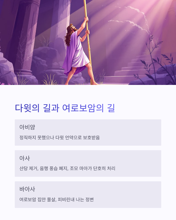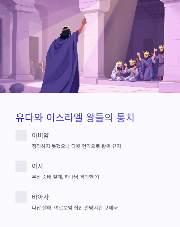 아비얌은 아버지 르호보암처럼 하나님 앞에 정직하지 못했으나, 다윗의 언약을 인하여 유다 왕위는 유지되고 전쟁은 하나님의 개입 속에 조율됩니다. 반면 그의 아들 아사는 산당을 제거하고, 음행의 풍습을 폐지하며, 조모 마아가조차 단호히 처리하는 결단을 보여줍니다. 그는 정치적 연합 대신 하나님을 의지하는 자세로 예루살렘 성전 중심의 신앙을 강화합니다. 그러나 북이스라엘에서는 바아사가 여로보암 집안을 몰살시키며 정권을 탈취하는 또 하나의 피비린내 나는 정변이 일어납니다.