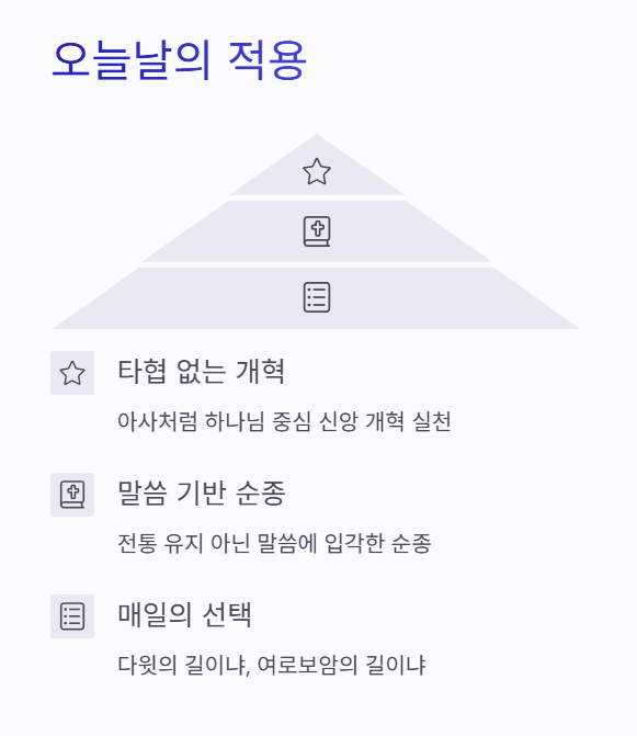 오늘날 신자와 교회는 아사처럼 타협 없이 하나님 중심의 신앙 개혁을 실천할 용기가 필요합니다. 신앙은 단지 전통을 유지하는 것이 아니라, 말씀에 입각해 새롭게 고쳐나가는 순종의 여정입니다. 반면 바아사처럼 권력을 위해 타인을 제거하고 정당성을 세우려는 행위는 결국 자기를 무너뜨리는 길임을 기억해야 합니다. 우리는 날마다 다윗의 길이냐, 여로보암의 길이냐는 선택 앞에 서 있습니다.