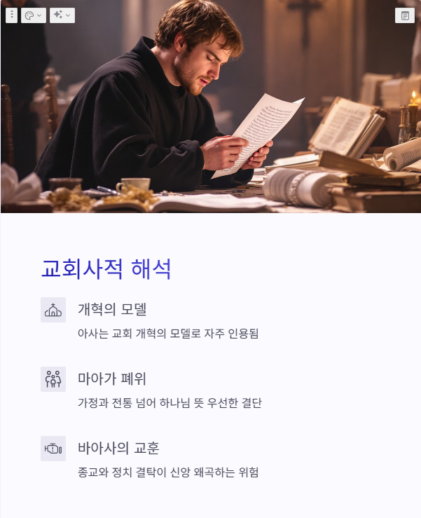 교회사에서 아사는 교회 개혁의 모델로 자주 인용되었습니다. 마아가의 폐위 사건은 가정과 전통을 넘어서 하나님의 뜻을 우선한 결단으로 평가되며, 루터와 칼빈은 성경적 신앙 수호를 위해 기존 권위를 깨는 데 아사의 본을 따를 필요가 있다고 보았습니다. 바아사의 정변은 제도화된 종교가 정치적 권력과 결탁하여 어떻게 신앙을 왜곡하는지를 보여주는 교훈으로 인용됩니다.
