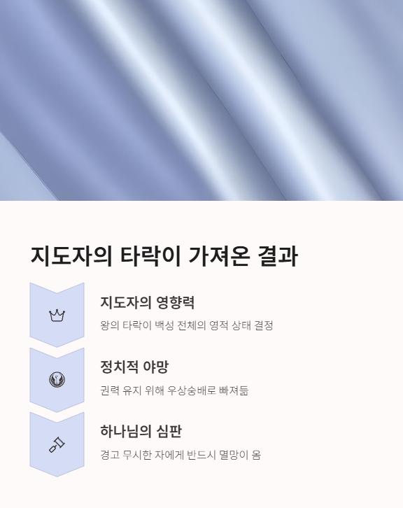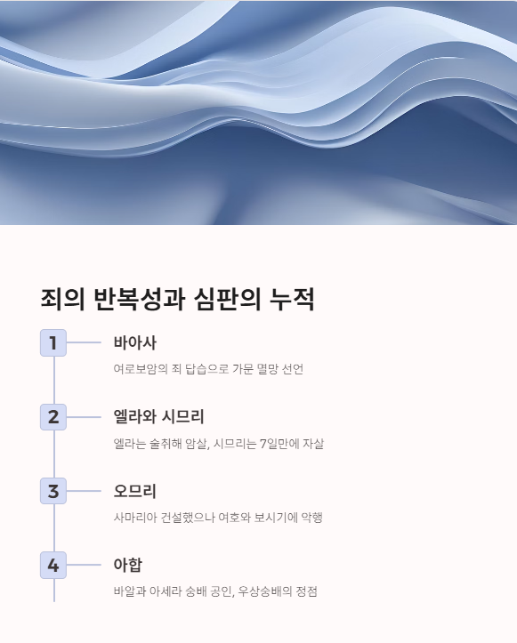 구약의 역사서는 지도자의 타락이 백성의 전반적 영적 상태를 결정지음을 명확히 보여줍니다. 이 장에서 왕들은 하나같이 정치적 정통성을 앞세우거나 권력을 유지하려다 우상 숭배로 빠져들며, 결국 하나님의 직접적인 심판을 불러옵니다. 바아사의 가문이 여로보암처럼 끝났듯, 하나님의 경고를 무시한 자는 반드시 멸망한다는 원칙이 반복됩니다.