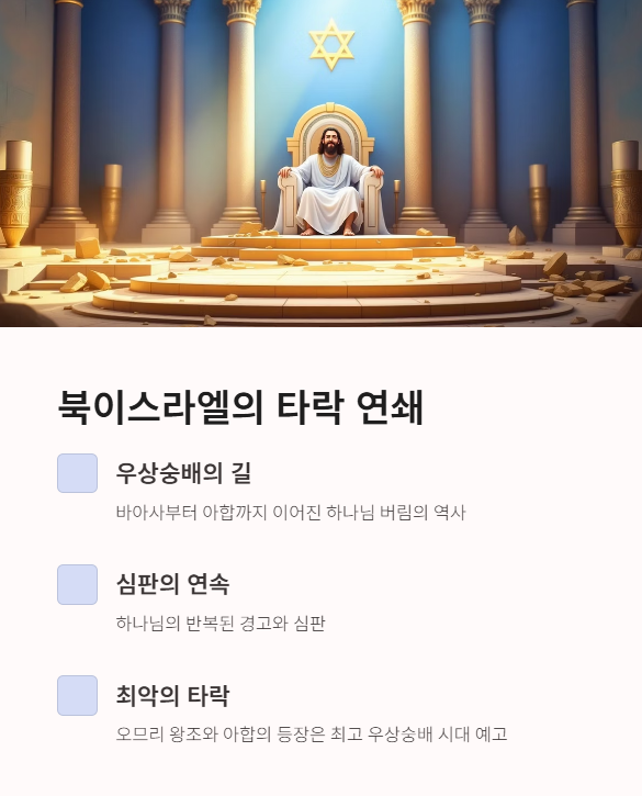 하나님은 바아사가 여로보암의 죄를 답습했기에, 그 가문을 여로보암처럼 끊으신다고 선언하십니다. 그의 아들 엘라는 술에 취해 암살당하고, 시므리는 7일 만에 왕위에서 쫓겨 자살합니다. 오므리는 강력한 정치력을 바탕으로 사마리아를 수도로 세우고 왕조를 일으키지만, 여호와 보시기에 악을 더욱 행합니다. 그리고 그의 아들 아합은 바알과 아세라 숭배를 공인하며 우상 숭배의 정점을 찍습니다. 이 모든 흐름은 한 번의 타락이 아니라 죄가 누적되며 점점 깊어지는 영적 추락의 과정입니다.