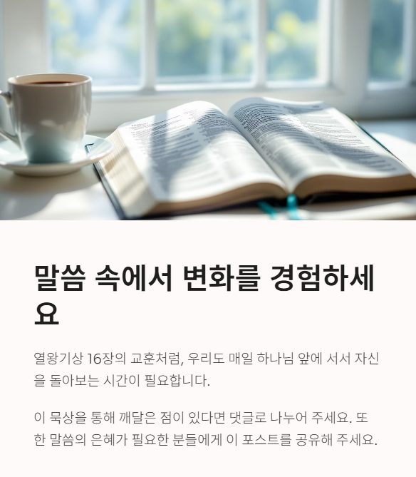 오늘날의 교회와 성도는 영적 타락은 갑작스러운 붕괴가 아니라, 반복된 타협과 회개의 유보에서 비롯된다는 사실을 기억해야 합니다. 지도자든 평신도든 말씀 앞에 서서 자신을 돌아보지 않는다면, 어느새 아합과 같은 신앙 파산 상태에 이를 수 있습니다. 우리는 하나님의 심판은 지연될 수 있으나, 결코 잊히지 않는다는 진리를 마음에 새기고, 날마다 말씀으로 정직하게 점검하며 살아가야 합니다.