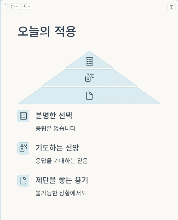 오늘날 우리는 침묵하는 우상과 응답하시는 하나님 사이에서 누구를 따를 것인지 날마다 선택하고 있습니다. 엘리야처럼 기도하고 응답을 기대하는 신앙, 불가능한 상황에서도 믿음으로 제단을 쌓는 용기가 필요합니다. 또한 하나님 앞에서 중립은 없으며, 회색 지대에 머무르지 말고 분명한 신앙의 고백과 행동이 요구됩니다.