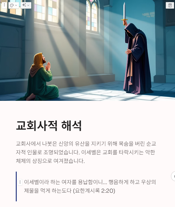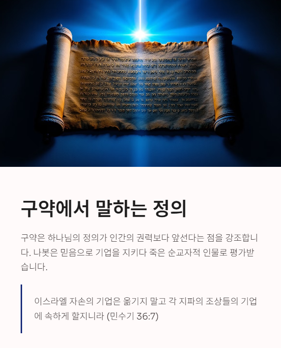 구약은 하나님의 정의가 인간의 권력보다 앞선다는 점을 반복적으로 강조합니다. 아합과 이세벨의 행위는 율법에 반하는 폭력과 부정직의 전형이며, 나봇은 믿음으로 기업을 지키다 죽은 순교자적 인물로 평가받습니다. 그의 죽음은 하나님의 나라에서 개인의 순종과 유산의 신앙적 의미를 강조하는 예증이기도 합니다.