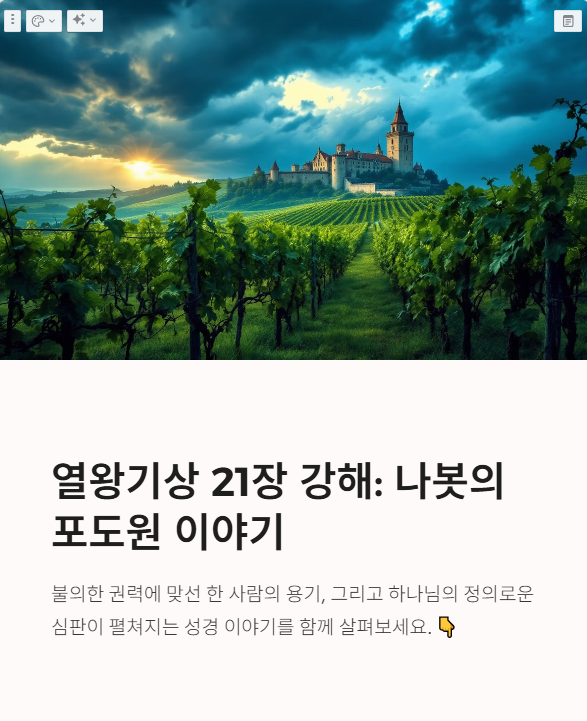 열왕기상 21장은 아합 왕이 이스르엘 사람 나봇의 포도원을 탐하다가, 그의 아내 이세벨의 계략으로 나봇을 죽이고 포도원을 빼앗는 이야기를 다룹니다. 이 사건은 불의한 권력과 거짓 증언에 의한 무고한 죽음, 그리고 그에 대한 하나님의 정의로운 심판이 중심입니다. 아합은 결국 엘리야를 통해 자신과 이세벨, 자손에게 임할 하나님의 저주를 듣고 회개하지만, 이는 임시적인 유예에 불과합니다.