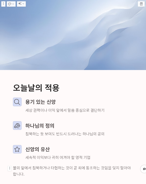 오늘날 우리는 세상 권력이나 이익 앞에서 나봇처럼 말씀 중심으로 결단할 수 있는 용기 있는 신앙인이 필요합니다. 하나님의 정의는 당장은 침묵하는 듯 보여도, 반드시 드러나고 집행된다는 믿음 안에서 살아가야 하며, 불의 앞에서 침묵하거나 타협하는 것이 곧 죄에 동조하는 것임을 잊지 말아야 합니다. 또한, 신앙의 유산을 세속적 이익보다 귀히 여기는 마음이 회복되어야 합니다.