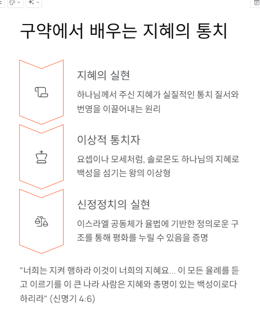 구약은 하나님께서 주신 지혜가 실질적인 통치 질서와 번영을 이끌어내는 원리를 강조합니다. 창세기의 요셉이나 모세처럼, 솔로몬도 하나님의 지혜로 백성을 섬기는 왕의 이상형으로 제시됩니다. 이 장은 신정정치의 실현 사례이며, 이스라엘 공동체가 율법에 기반한 정의로운 구조를 통해 평화를 누릴 수 있음을 증명합니다.