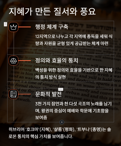 솔로몬은 왕국을 12지역으로 나누고 각 지역에 총독을 세워 식량과 자원을 균형 있게 공급받는 행정 체계를 마련합니다. 이는 단순한 관리 행위가 아니라, 백성을 위한 정의와 효율을 기반으로 한 지혜의 통치 방식입니다. 이와 동시에 이스라엘은 북과 남, 동과 서에 걸쳐 평화를 누리며, 경제적 풍요와 문학적·지적 발전이 공존하는 이상적인 시기를 경험합니다. 솔로몬은 3천 가지 잠언과 천 다섯 곡조의 노래를 남기며, 왕권의 중심이 예배와 학문에 기초함을 보여줍니다.