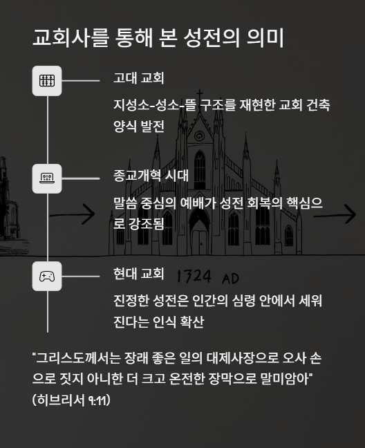 구약에서는 성전이 단순한 건물이 아니라, 하나님의 통치와 백성과의 언약을 시각화한 상징물로 이해됩니다. 출애굽기의 성막이 이동식 하나님의 임재처소였다면, 성전은 정착된 하나님의 영원한 통치의 표현입니다. 이 구조는 에덴 동산의 회복과 예배 질서의 중심을 함축하고 있습니다.