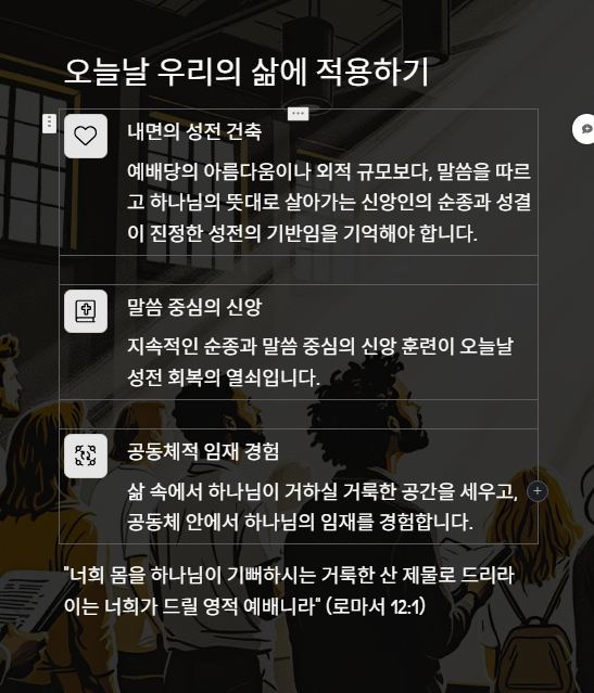 오늘날 우리는 예배당의 아름다움이나 외적 규모보다, 말씀을 따르고 하나님의 뜻대로 살아가는 신앙인의 순종과 성결이 진정한 성전의 기반임을 기억해야 합니다. 삶 속에서 하나님이 거하실 거룩한 공간을 세우고, 지속적인 순종과 말씀 중심의 신앙 훈련이 오늘날 성전 회복의 열쇠입니다.