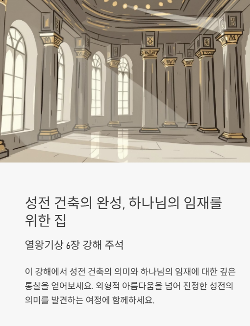 열왕기상 6장은 솔로몬이 성전 건축을 본격적으로 시작하고, 그 구조와 세부적인 설계를 상세히 기술하는 장입니다. 이 성전은 이스라엘 역사상 가장 거룩한 상징물이자, 하나님께서 임재하시는 처소로서의 신학적 의미를 담고 있습니다. 건축은 외적 웅장함을 넘어서, 하나님의 언약과 순종의 삶 위에 세워지는 집으로 묘사됩니다.