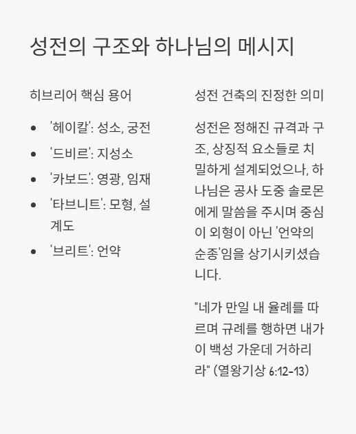 성전은 정해진 규격과 구조, 상징적 요소들로 치밀하게 설계된 건축물입니다. 그러나 하나님은 공사 도중 솔로몬에게 말씀을 주시며 중심이 외형이 아닌 ‘언약의 순종’임을 상기시킵니다. 성전은 단순히 하나님을 위한 거처가 아니라, 백성이 율법을 따라 행할 때 하나님의 임재가 유지되는 조건부의 약속 공간입니다. 화려한 백향목과 금으로 덮인 성전일지라도, 하나님께서 기뻐하시는 것은 백성의 마음과 삶의 거룩함임이 강조됩니다.