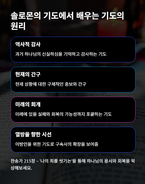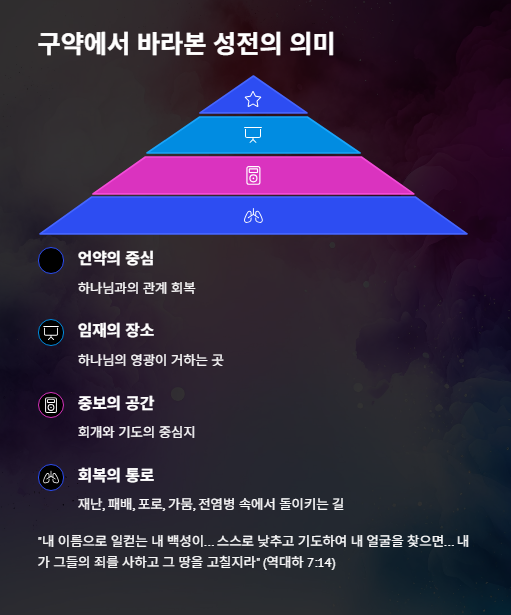구약은 성전을 단순한 제사의 장소가 아닌, 언약과 임재, 회복과 중보의 중심 공간으로 이해합니다. 솔로몬의 기도는 출애굽 이후의 하나님과의 관계 회복, 다윗 언약의 성취, 미래의 회개까지 포괄하는 대서사로 구성되어 있습니다. 특히 재난, 패배, 포로, 가뭄, 전염병 등 각 상황 속에서 하나님께로 돌이키는 회개의 길이 성전을 통해 연결됨을 강조합니다.
