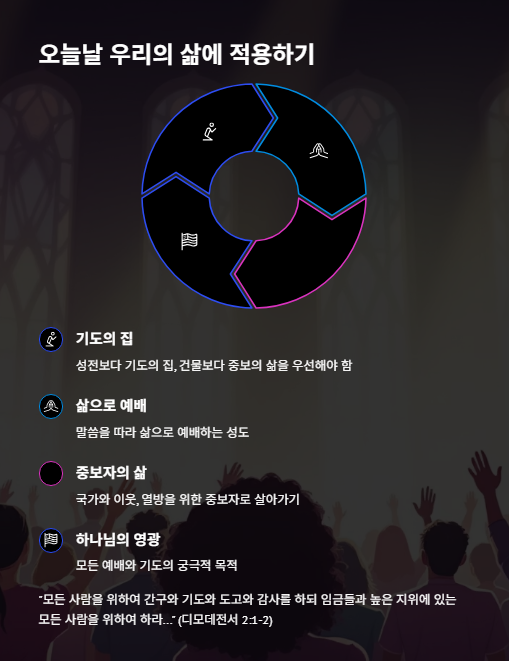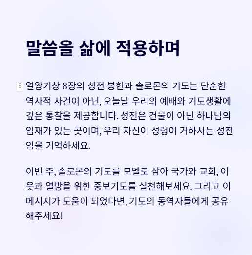 오늘날 교회는 성전보다 기도의 집, 건물보다 중보의 삶을 우선해야 함을 이 장을 통해 배워야 합니다. 성도는 말씀을 따라 삶으로 예배하고, 국가와 이웃, 열방을 위한 중보자로 살아가야 하며, 성전의 목적은 죄인의 회복과 이방인을 향한 포용, 그리고 하나님의 영광을 위한 공간이어야 합니다. 솔로몬의 기도는 오늘날 목회자와 신자 모두에게 대표기도와 개인 기도의 기준이 됩니다.