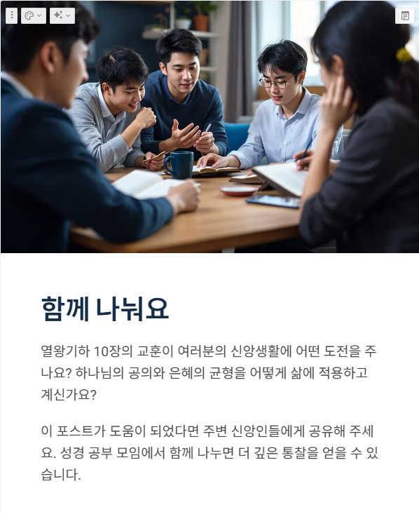오늘날 우리는 하나님의 공의를 기억하고, 죄와 타협하지 않는 신앙적 결단을 내려야 합니다. 그러나 예후처럼 자기의 의로움과 정치적 계산으로 하나님의 뜻을 왜곡하지 않도록 주의해야 하며, 진정한 회개와 하나님 중심의 순종을 삶 속에 실천해야 합니다.
