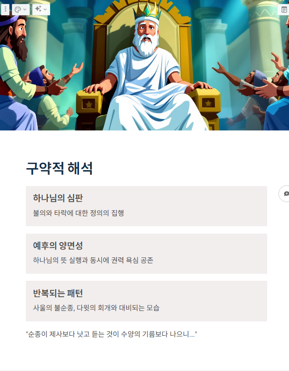 사무엘상 15 강해 주석 – 순종의 중요성과 사울의 몰락 목차사무엘상 15장 개요본문 주석 – 아말렉과의 전쟁과 사울의 불순종히브리어 원문 분석사무엘과 사울의 대면구약적 해석신약적 해석