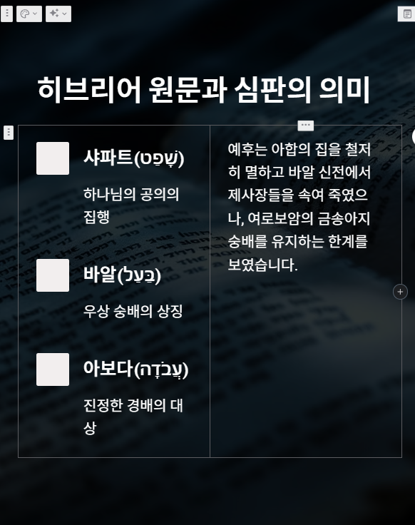 - 'שָׁפַט'(샤파트): ‘심판하다’ – 하나님의 공의의 집행