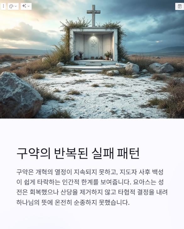 구약은 개혁의 열정이 지속되지 못하고, 지도자의 죽음 이후 백성이 쉽게 타락하는 인간적 한계를 드러냅니다. 요아스는 여호야다의 지도로 성전을 회복하였지만, 산당을 제거하지 않고 타협적 정치적 결정을 내려 하나님의 뜻에 온전히 순종하지 못했습니다. 이는 이스라엘 왕정의 반복되는 실패 패턴을 상징합니다.