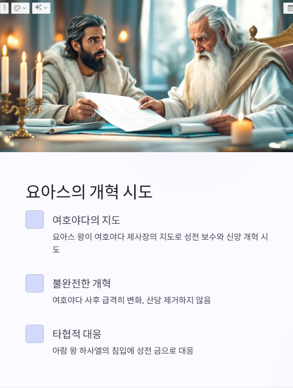 요아스는 성전을 보수하며 하나님의 집을 회복하는 열심을 보입니다. 백성들은 자발적으로 은을 바쳐 성전 수리 작업을 지원합니다. 그러나 여호야다의 죽음 이후 요아스는 산당을 제거하지 않고, 아람 왕 하사엘의 공격에 성전의 금과 보물을 헌납하며 타협적인 모습을 보입니다. 이는 신앙 개혁의 의지는 있었으나 끝까지 완전하게 나아가지 못한 현실적 한계를 보여줍니다.