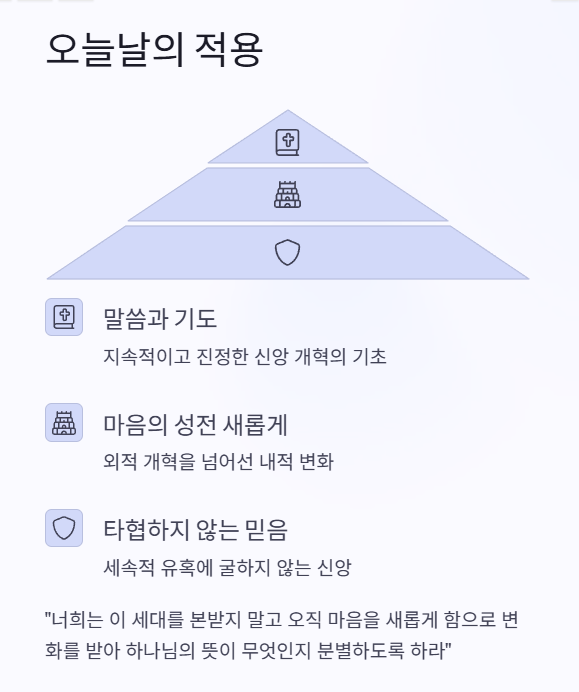 오늘날 우리는 말씀과 기도로 지속적이고 진정한 신앙 개혁을 이루어야 합니다. 요아스처럼 외적 개혁과 봉헌에 머물지 않고, 마음의 성전까지 새롭게 해야 하며, 세속적 유혹과 타협에 넘어가지 않도록 하나님의 뜻을 끝까지 붙드는 믿음이 필요합니다.