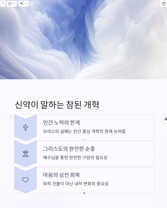 신약은 참된 개혁과 구원은 인간의 노력으로는 불가능하며, 예수 그리스도의 십자가와 은혜로만 완성됨을 강조합니다. 요아스의 실패는 예수님의 완전한 순종과 교회의 진정한 개혁의 필요성을 드러냅니다. 성전 보수는 단순한 건물의 수리가 아니라, 마음의 성전을 회복하는 진정한 개혁으로 이어져야 함을 시사합니다.