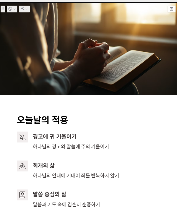 오늘날 우리는 하나님의 인내에 기대어 죄를 반복하지 않도록 주의해야 합니다. 말씀과 기도 속에 회개하고, 겸손히 순종하며 하나님의 경고에 귀 기울여야 합니다. 하나님의 오래 참으심은 회개의 기회로, 거룩한 삶을 위한 기회임을 잊지 말아야 합니다.