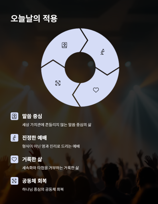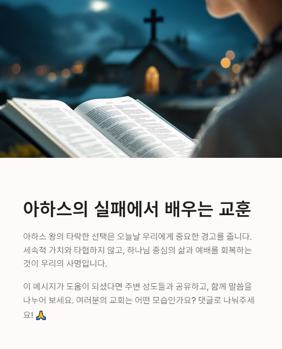 오늘날 우리는 세상의 가치관과 정치적 계산에 흔들리지 않고, 말씀 중심의 진정한 예배와 거룩을 회복해야 합니다. 아하스처럼 타협과 세속화로 성전을 더럽히지 말고, 삶 속에서 영과 진리로 하나님께 나아가야 합니다.