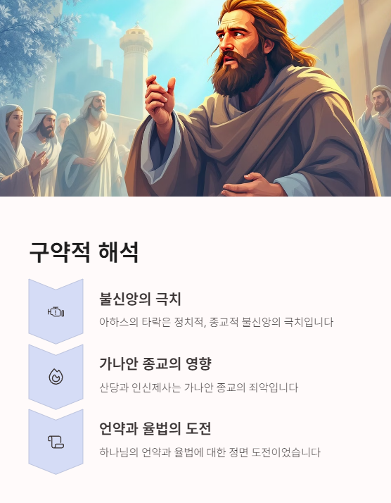 구약은 아하스의 타락을 하나님을 떠난 정치적, 종교적 불신앙의 극치로 경고합니다. 산당과 인신제사는 가나안 종교의 영향을 받은 죄악이며, 하나님은 이러한 우상숭배를 철저히 금하셨습니다. 아하스의 행위는 출애굽 이후의 언약과 율법에 대한 정면 도전으로, 예언자들의 경고와 심판을 초래합니다.