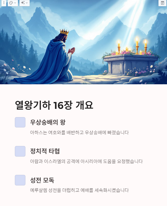 열왕기하 16장은 유다 왕 아하스가 여호와를 배반하고 우상숭배에 빠지는 사건과 아람 및 이스라엘의 공격, 그리고 아시리아에 도움을 요청하며 타락한 정치적 선택을 하는 내용을 다룹니다. 아하스는 예루살렘 성전을 더럽히고, 아시리아 왕을 의지하며 예배를 세속화시킵니다. 이는 하나님을 떠난 정치적, 종교적 타락의 표본으로 기록됩니다.