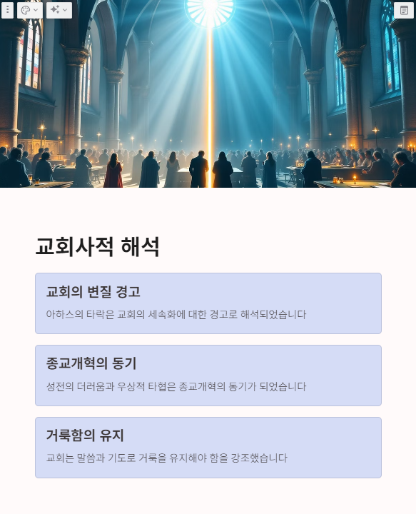 교회사는 아하스의 타락을 교회의 변질과 세속화에 대한 경고로 해석했습니다. 성전의 더러움과 우상적 타협은 종교개혁의 동기가 되었으며, 교회가 말씀과 기도로 거룩을 유지해야 함을 강조했습니다.