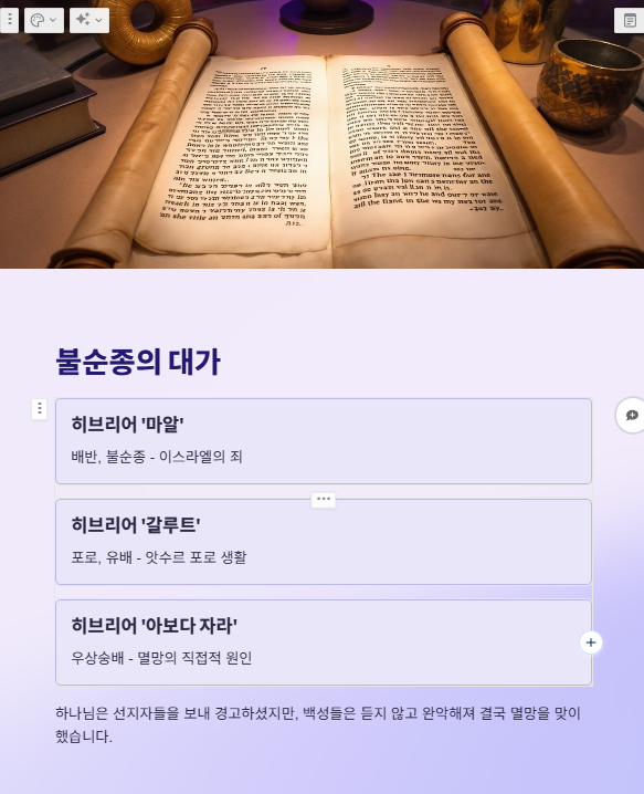 오늘날 우리는 하나님의 경고를 무시하지 말고, 우상숭배와 타협의 죄에서 벗어나야 합니다. 하나님의 말씀에 순종하고, 회개하며 거룩을 지키는 삶을 살아야 합니다. 하나님의 인내는 무한하지만, 회개 없는 완악함은 결국 심판을 불러온다는 경고를 마음에 새겨야 합니다.