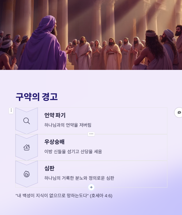 "내 백성이 지식이 없으므로 망하는도다 네가 지식을 버렸으니 나도 너를 버려 내 제사장이 되지 못하게 하리라" (요약)