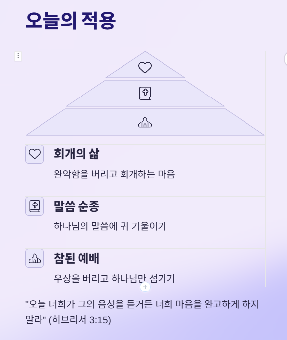 오늘날 우리는 하나님의 경고를 무시하지 말고, 우상숭배와 타협의 죄에서 벗어나야 합니다. 하나님의 말씀에 순종하고, 회개하며 거룩을 지키는 삶을 살아야 합니다. 하나님의 인내는 무한하지만, 회개 없는 완악함은 결국 심판을 불러온다는 경고를 마음에 새겨야 합니다.